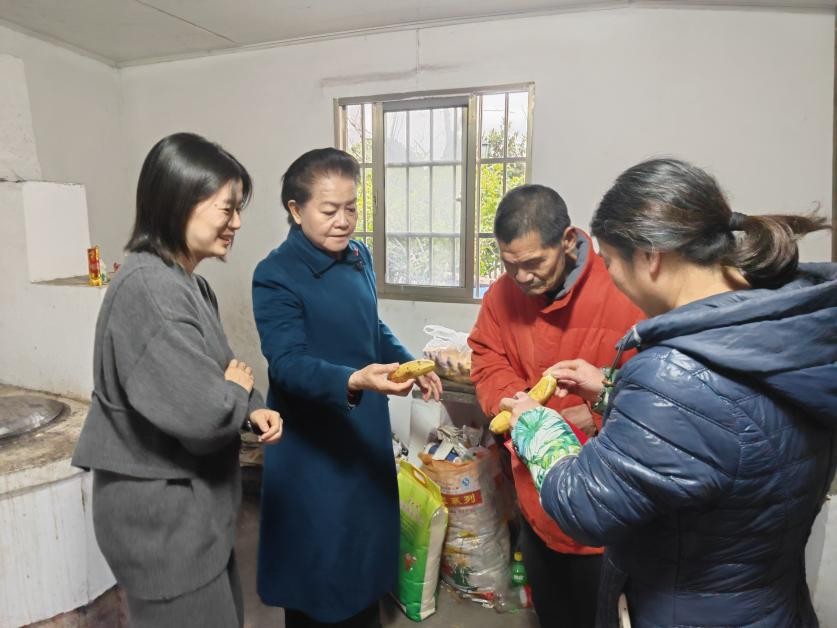 随后,调研组来到另一户残疾人楼根土家中。楼根土老人为智力残疾二级,生活仅能简单自理,至今未婚。其父母与弟弟均已逝世,目前由弟媳楼月娥照料,楼月娥也始终尽力守护家人。见到老人后,吴红大姐为他剥香蕉,老人十分开心,高兴地连吃了两根,脸上洋溢着灿烂的笑容。调研组一边鼓励楼根土老人好好生活、保持乐观心态,一边叮嘱弟媳楼月娥,若遇到困难可随时向以孝治家三支队伍寻求帮助。