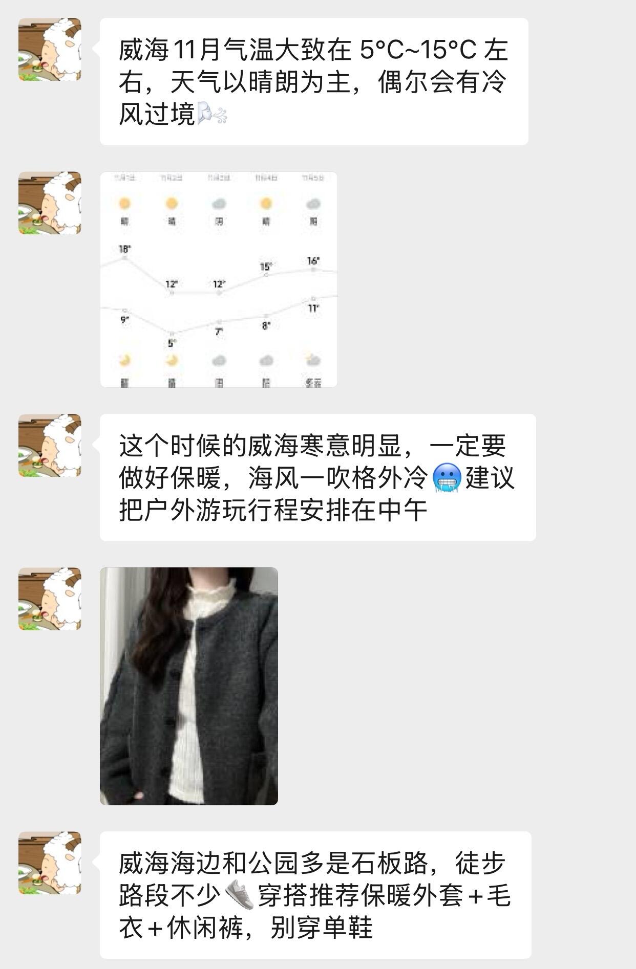🍂天气多以晴冷为主,偶尔会有冷风或小雨,出门前记得查看实时天气,晴天时海边风光格外清透,拍照很有氛围感~🧥11 月的威海寒意渐浓,建议携带保暖外套、毛衣、针织衫、长裤等衣物,搭配围巾、帽子更稳妥,避免受凉