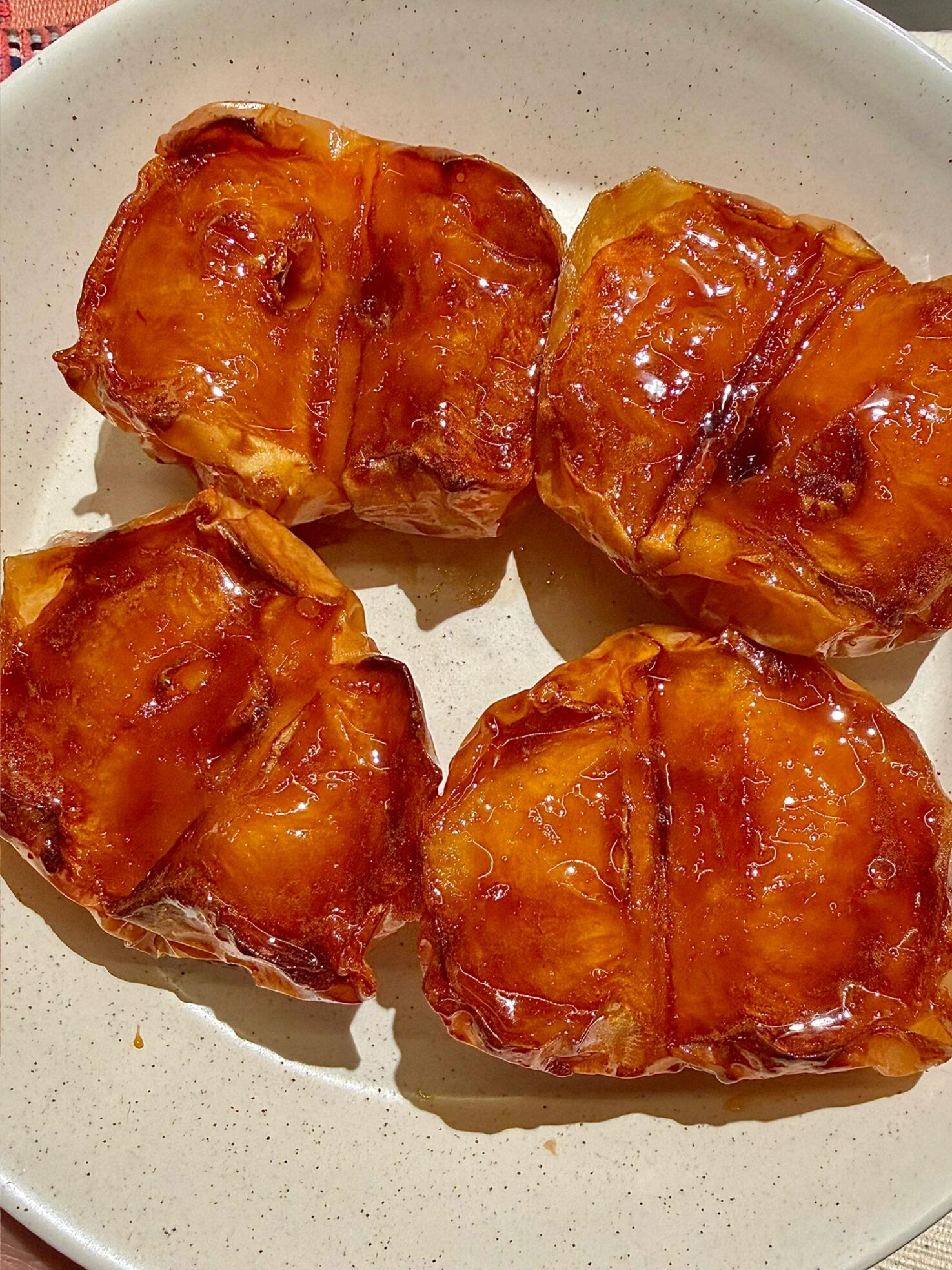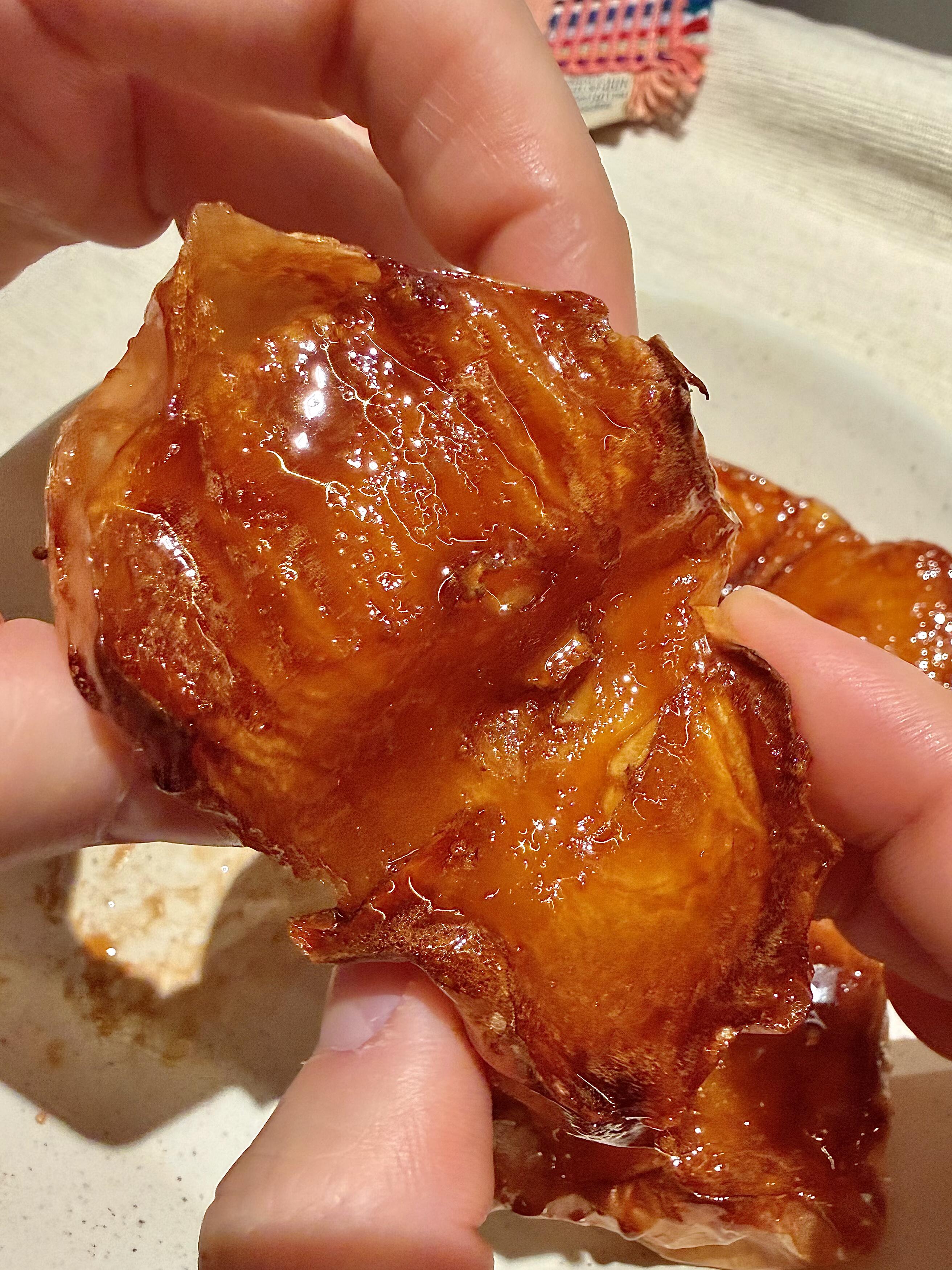 如果晾到凉一点再吃,表面的糖浆会形成一层薄薄的焦糖脆壳——咬下去“咔嚓”一声,里面是软糯的果肉,口感层次特别丰富。外面脆脆的,里面软软的,焦糖的甜和苹果的酸在嘴里交织,比任何精致的甜品都让人满足。