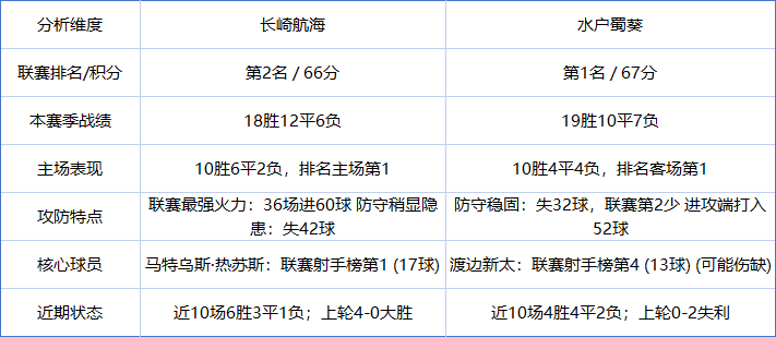 这场日职乙的榜首大战看点十足,长崎航海与水户蜀葵积分仅差1分,是名副其实的“天王山之战”。下面我为你详细解析一下这场比赛。