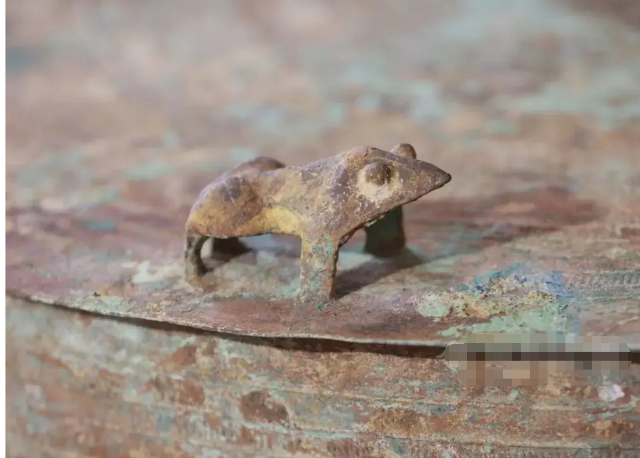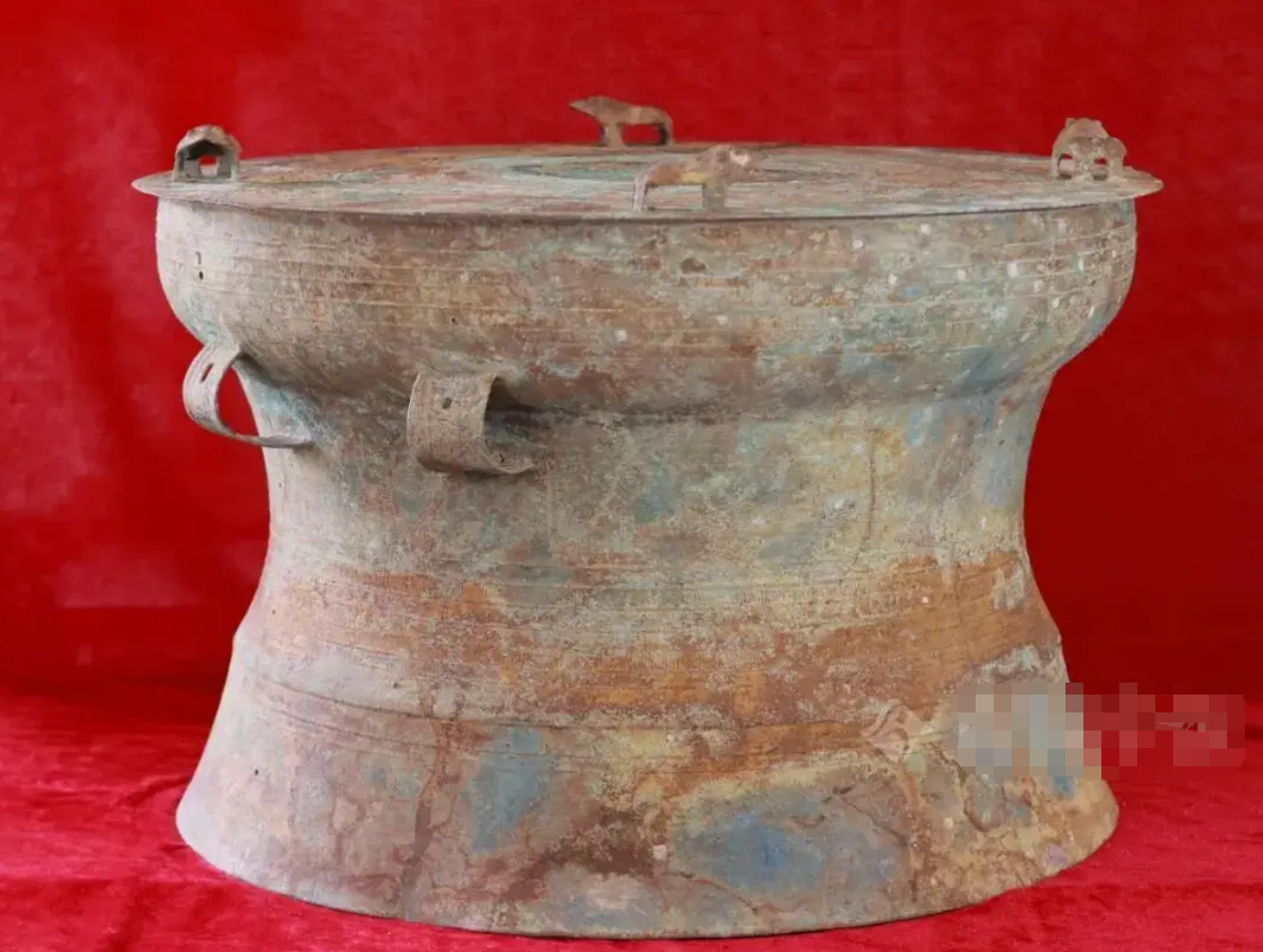 虽历经千年埋藏,铜鼓的青铜质地依然坚固。轻叩鼓面,竟还能发出清越悠远的声响,仿佛穿越时空的余韵。