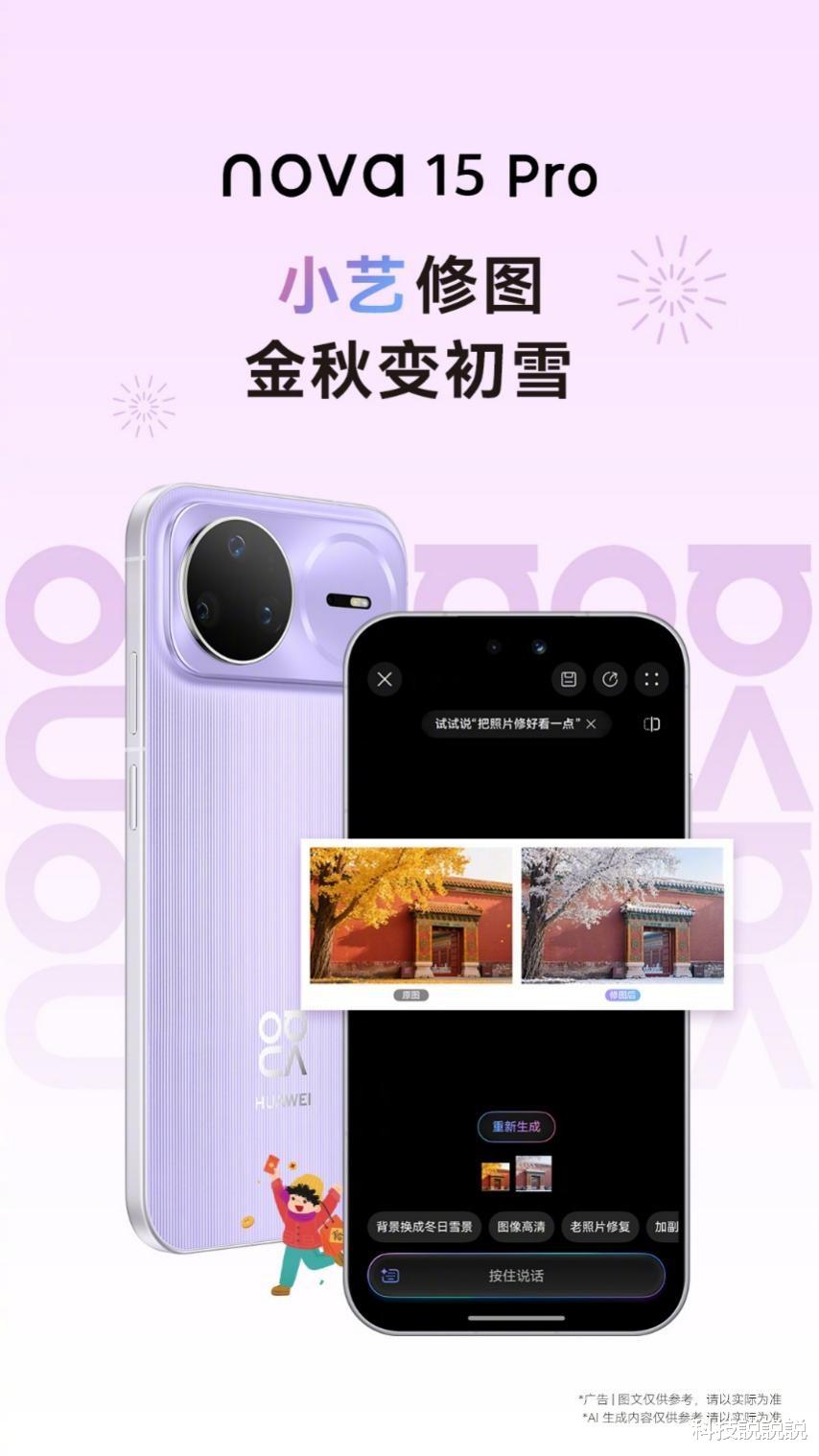 同时,nova 15系列全系搭载鸿蒙操作系统 6,拥有更智能、更流畅、更趣味、更安全的用机体验。AI沾色功能让用户一键复刻参考图片的色调风格,简化后期编辑;动态海报名片支持个性化设计,便于社交分享;全新趣味主题则与情绪联动,提供自定义桌面,增强趣味性。小艺智能体更聪明、更能干,可以协助用户处理日常事务,提升效率。在安全层面,星盾安全架构强化隐私保护,包括防窥提醒和加密分享。