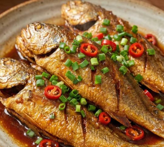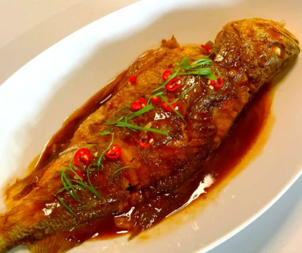 煎透的小黄鱼外皮微皱,浸满酱汁后泛着红亮的油光。夹一条放进碗里,筷子从鱼身最厚处夹下去,蒜瓣状的鱼肉应声分开,白嫩细腻,冒着热气。蘸一点盘底的酱汁,酸甜味渗进鱼肉纹理,刚好压住鱼的鲜腥,又不会盖过本味。这种鱼刺不多,主刺两侧的肉最是肥美,连皮带肉送进嘴里,外层的焦香和里层的软嫩混在一起,酸甜适口。