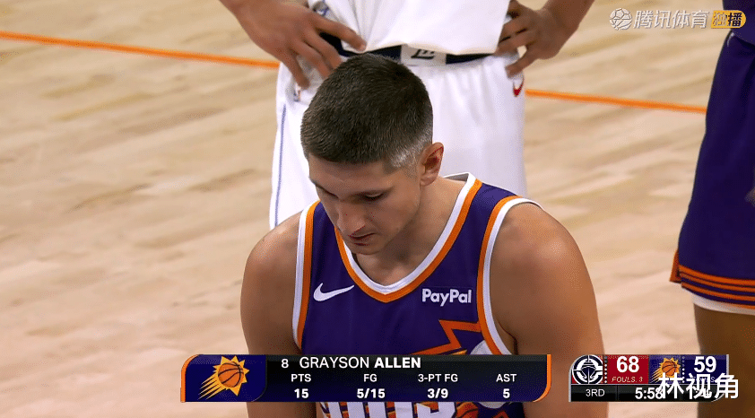 暂停回来,狄龙两分打进,总算开张了,阿伦三分也中,太阳回应一波5-0,将分差缩小到个位数。