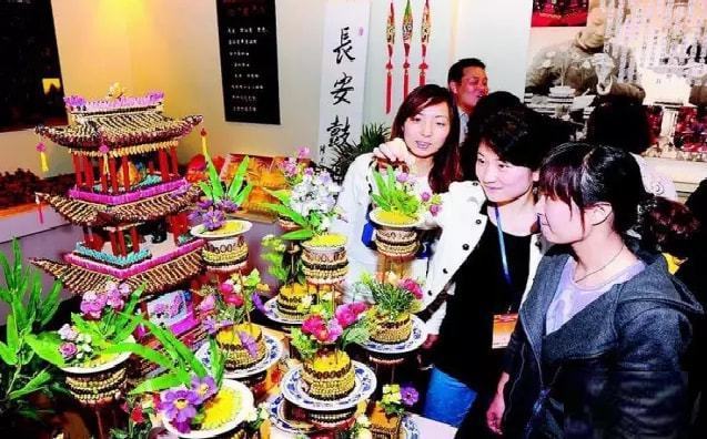 在陕西,祭祀关公时有一种叫“添碟子”(又叫花碟)的贡品,做法是:用一粒粒饱满的大黄豆排成屋檐,各种彩色的豆子、瓜子、桃仁被竹棍嵌接,一层层码在由几个碟子架起来的造型上,最后形成一座精巧的亭台楼阁。