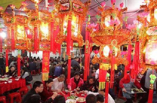 “升灯办酒席”也叫“灯酒”、即“丁酒”,也就是“添丁”的人家摆酒席,宴请邻居街坊、亲朋好友,一起庆祝自家“添丁”。同时,也向所有参加“灯酒”的亲友表达人丁兴旺的祝福。