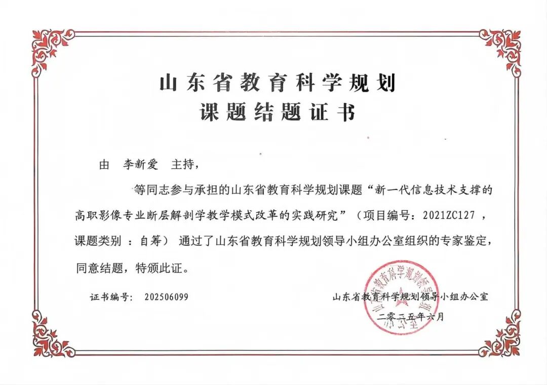 科研创新亮点频现,开展非遗与医药卫生专业课堂深度融合研究,探索多元融合育人路径,率先构建卫生宣传策略体系,创新课程思政教学路径,李新爱主持结项山东省教育科学规划课题《新一代信息技术支撑的高职影像专业断层解剖学教学模式改革的实践研究》,为相关领域贡献实践范例。
