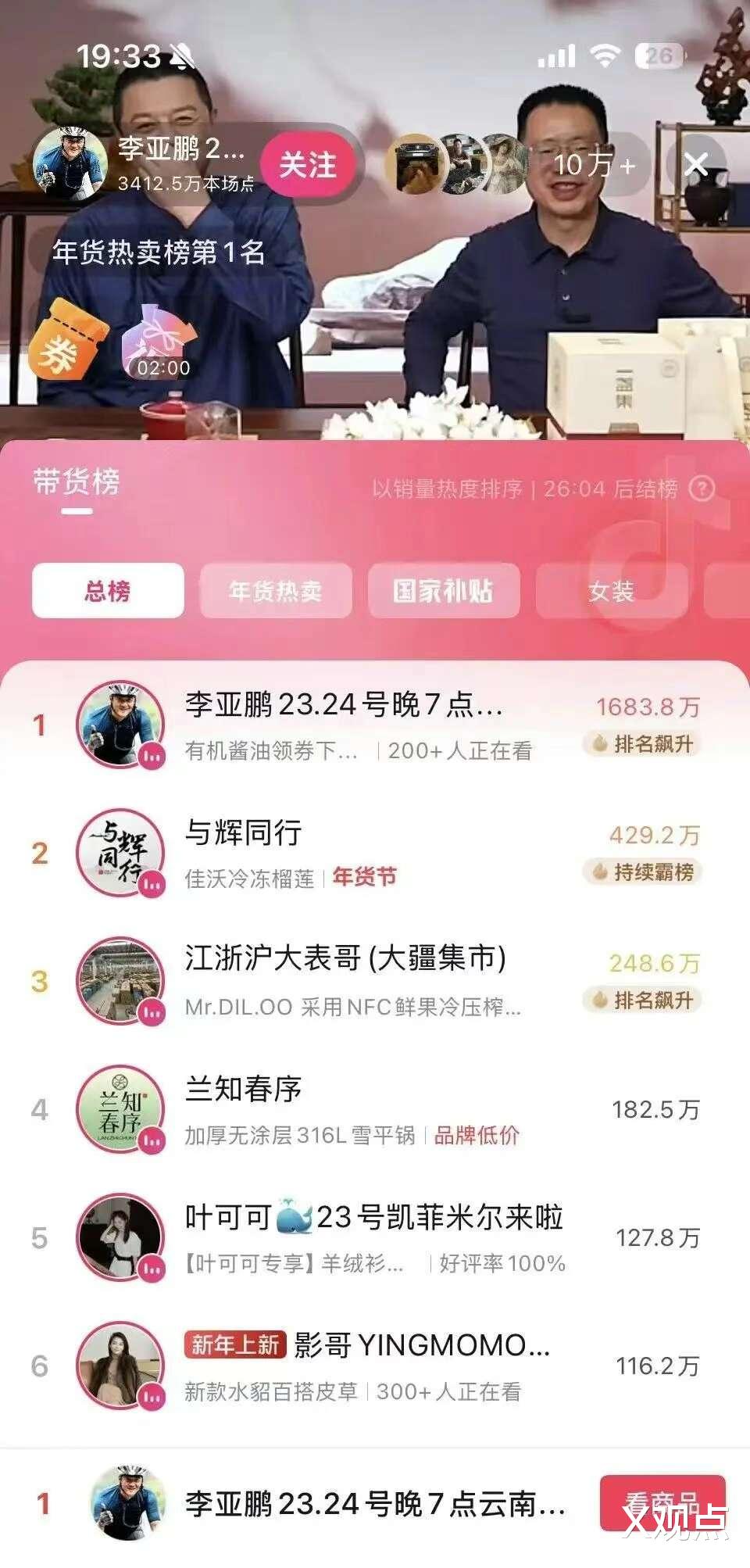 1月23日晚,李亚鹏直播开播,直播间瞬间涌入超10万人在线观看,累计场观达3412.5万。他以1683.8万的超高热度登顶抖音带货总榜第一,远超排名第二的"与辉同行"(429.2万)。
