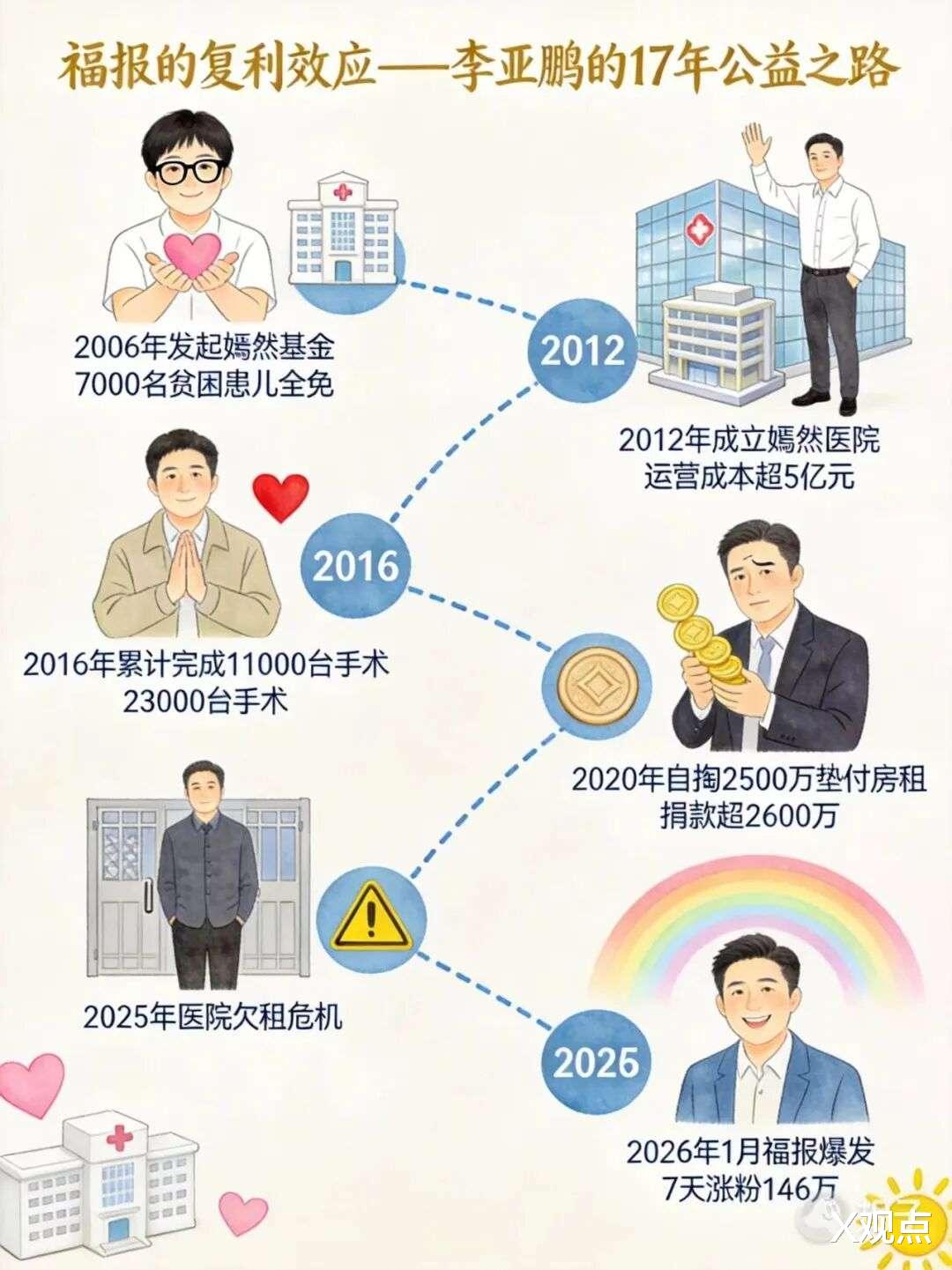 2026年1月14日,李亚鹏发布名为《最后的面对》的31分钟无剪辑视频,详细解答了北京嫣然天使儿童医院因拖欠2000万租金而面临迁址甚至关停的困境。他说,十年完成11000台唇腭裂手术,7000名患儿全额免费,过去5年他个人垫付租金2500万。