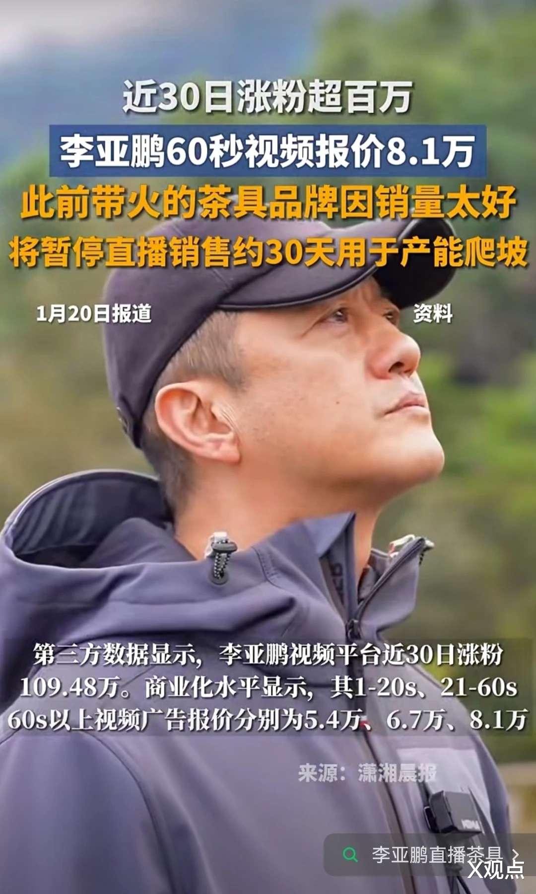 1月20日数据更惊人:近7天内,李亚鹏粉丝增量达132.9万,仅1月19日就涨粉超46万,位居涨粉榜第一。目前他的1-20秒、21-60秒、60秒以上视频广告报价分别为5.4万元、6.7万元、8.1万元。