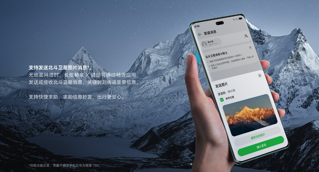 在户外作业或长途差旅中,不少工作者都曾面临地面网络信号中断的困扰——关键时刻联系不上团队、无法同步进度,工作推进往往受阻;而长时间在外奔波,频繁使用手机进行导航、沟通、记录,电量焦虑更是如影随形。华为畅享 70X 尊享版搭载的双向北斗卫星消息功能,打破了地面网络限制,即便身处信号盲区,也能通过长按畅享X键快速与外界保持联系,为出行安全与工作衔接提供关键保障。