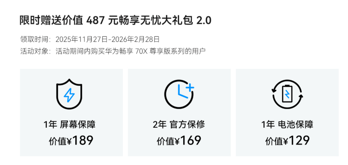 更重要的是,华为畅享 70X 尊享版售价1999元起,现在购买还有新品优惠。购机用户还可同步领取价值487元的“畅享无忧大礼包2.0”,内含1年屏幕意外保障、2年官方保修及1年电池焕新服务,真正实现从购买到使用的全程安心。