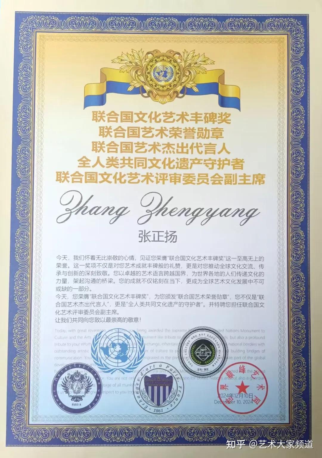 2022年1月20日荣获“诺贝尔国际艺术奖”,并授予“诺贝尔奖章”和“国际艺术巅峰人物”荣誉称号。2022年3月1日荣获“世界艺术金皇冠奖”,并授予“世界十大顶级皇冠艺术家”荣誉称号。2022年5月15日荣获“俄罗斯全球艺术列宁奖”,并授予“莫斯科环球艺术家”荣誉称号。2022年5月18日荣获“毕加索国际艺术金奖”,并授予“世界馆藏级艺术家”荣誉称号。2022年6月10日荣获“世界文化艺术最高荣耀奖”,颁发“世界艺术荣耀勋章”,并授予“世界最具影响力文化艺术大师”称号。2022年6月20日荣获“世界教科文贡献奖“,并授予“世界十大艺术大师”和“全球十大艺术影响力人物”荣誉称号。2023年11月24日荣获“中法建交60周年全球艺术投资巅峰奖”,授予“全球最具投资价值与收藏潜力艺术家”和“中法建交60周年文化艺术大使”荣誉称号,并被聘为“法国皇家艺术学院特聘教授”。2024年10月23日荣获“世界文艺和平先锋奖”,授予“世界文艺和平大使”称号,并荣膺“世界十大文艺巨匠”及“人类和平先峰勋章”。特聘为“国际和平研究会理事”。2024年10月23日荣获“教科文艺术大师奖”,并授予“世界艺术影响力领袖”荣誉称号和“全球艺术巨匠勋章”。2024年12月10日荣获“联合国文化艺术丰碑奖",颁发“联合国艺术荣誉勋章”,授予“联合国艺术杰出代言人”和“全人类共同文化遗产的守护者”荣誉称号。