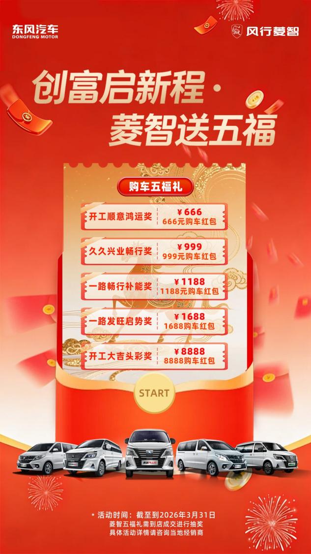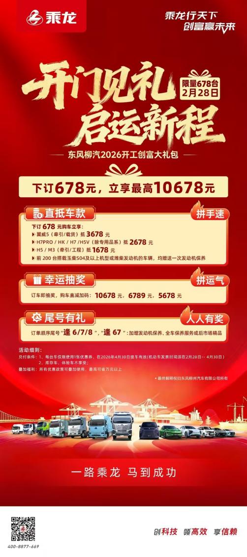 更有诚意拉满的专属购车福利等你来享!乘龙系列交付订金的客户至高可享10678元优惠,还能抽取全车保养、发动机保养、定制盲盒等好礼;菱智系列狂撒至高8888元购车红包,多种额度鸿运红包抽不停,不管是做物流、跑运输,还是自主创业,都能享受到实打实的购车优惠,让实干者收获满满,让创富者步履更坚。
