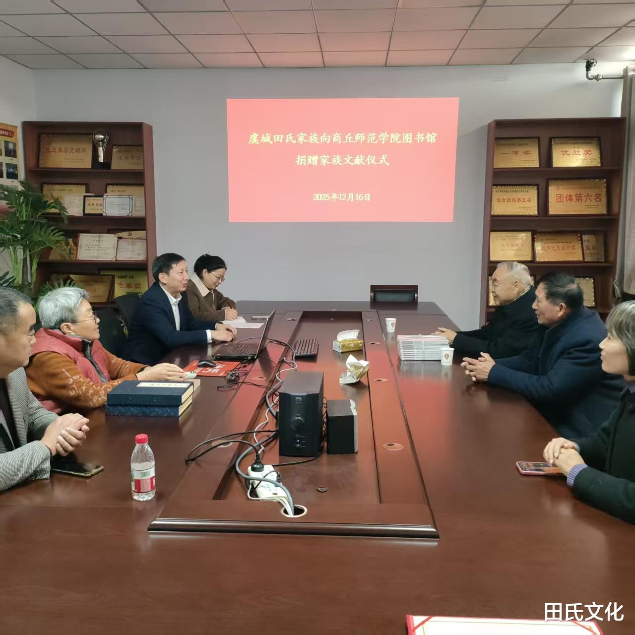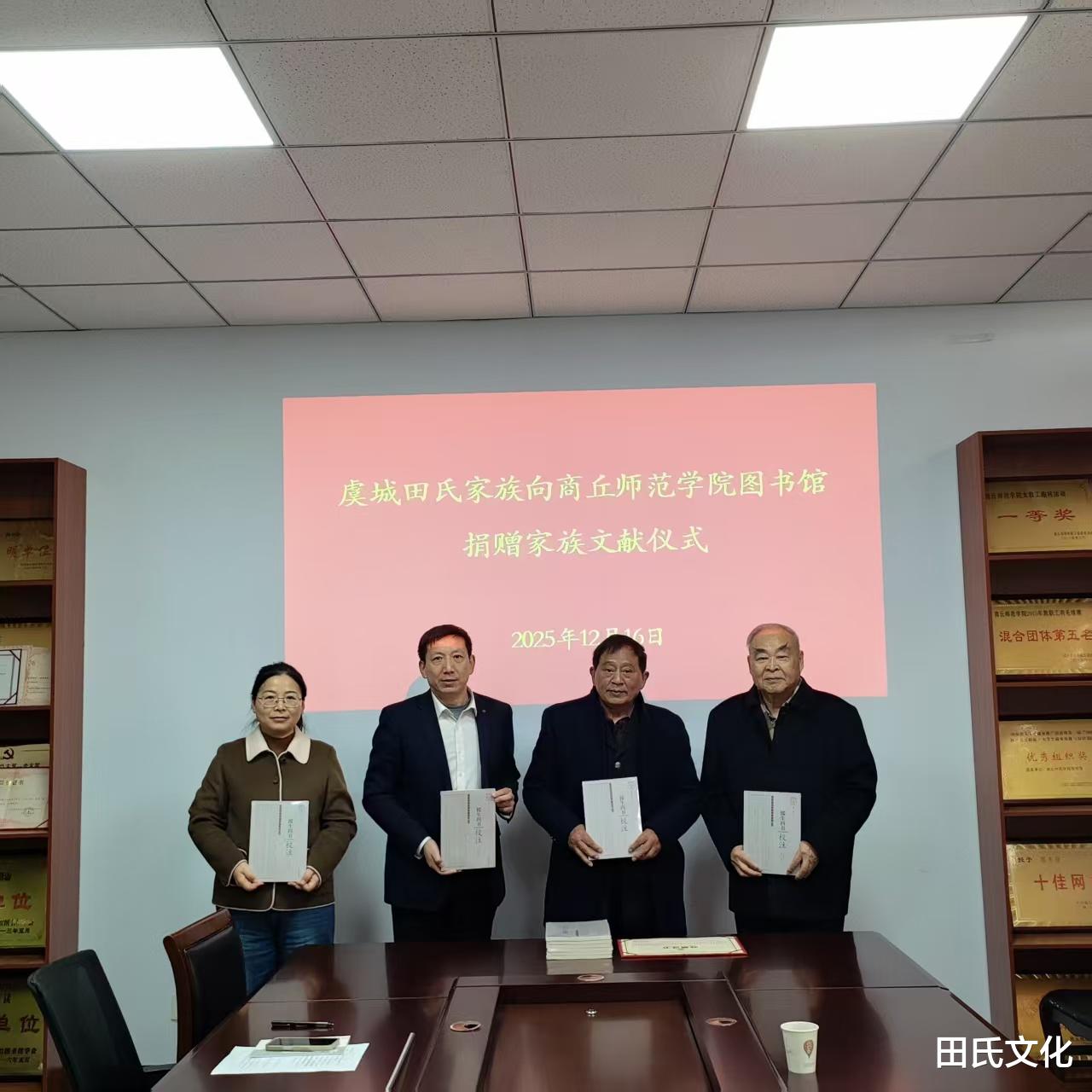 2025年12月16日上午,《援生四书校注》捐赠仪式在商丘师范学院图书馆六楼会议室隆重举行。图书馆副馆长李卫军、张颜梅、办公室主任刘恒刚、特藏部主任王秋霞、原商丘职业技术学院党委书记、现商丘市姓氏文化研究会名誉会长田启义、商丘市城乡一体化示范区陈集村村民田启军、原特藏部主任、现商丘市姓氏文化研究会常务副会长兼商丘家谱馆馆长贾光等参加捐赠仪式。
