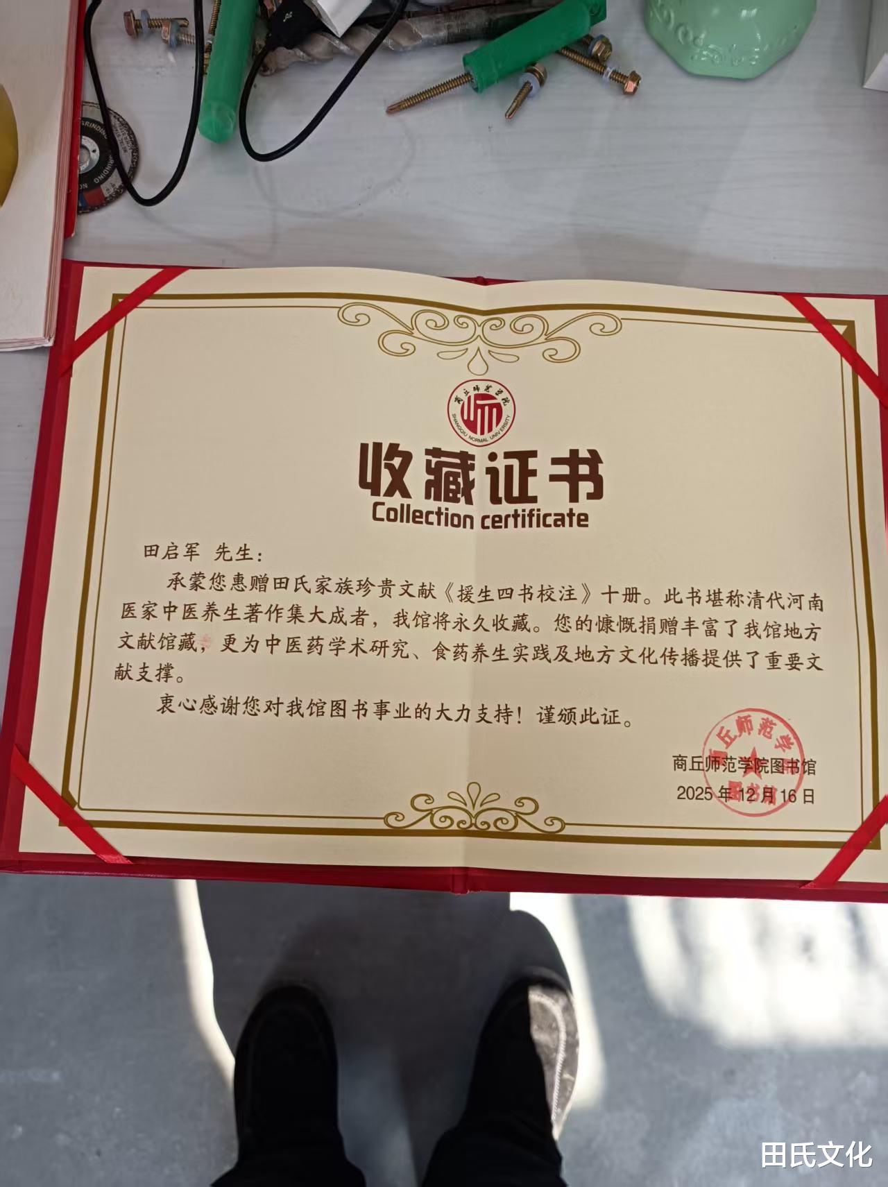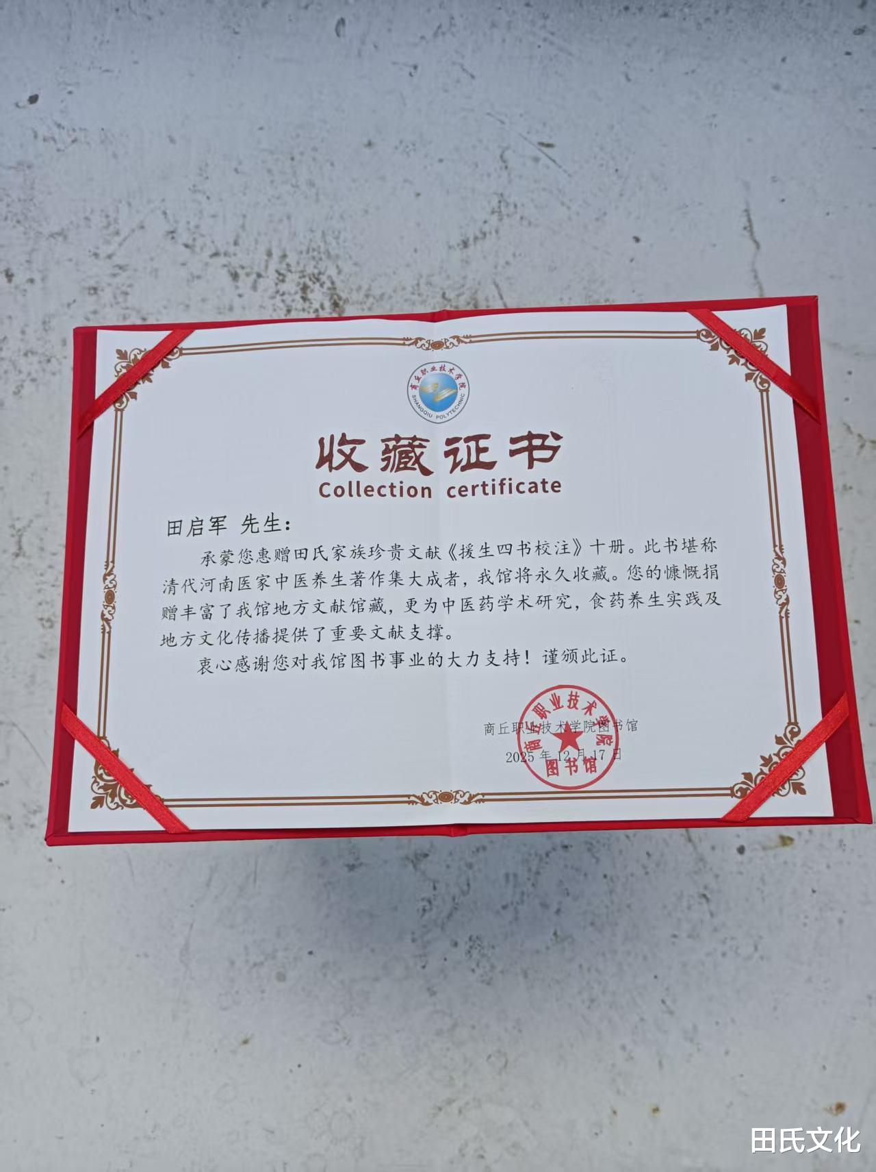 2025年12月16日-2026年1月9日,清朝河南重要医学家田绵淮的第六代嫡孙田启军分别将《援生四书校注》捐赠予商丘师范学院图书馆和商丘职业技术学院图书馆,为商丘师范学院、商丘职业技术学院师生的学术研究以及社会各界中医药文化爱好者提供了文献资源,该书获得专业收藏与保护,对传承地方文化、推动中医养生文化发展具有重要意义。