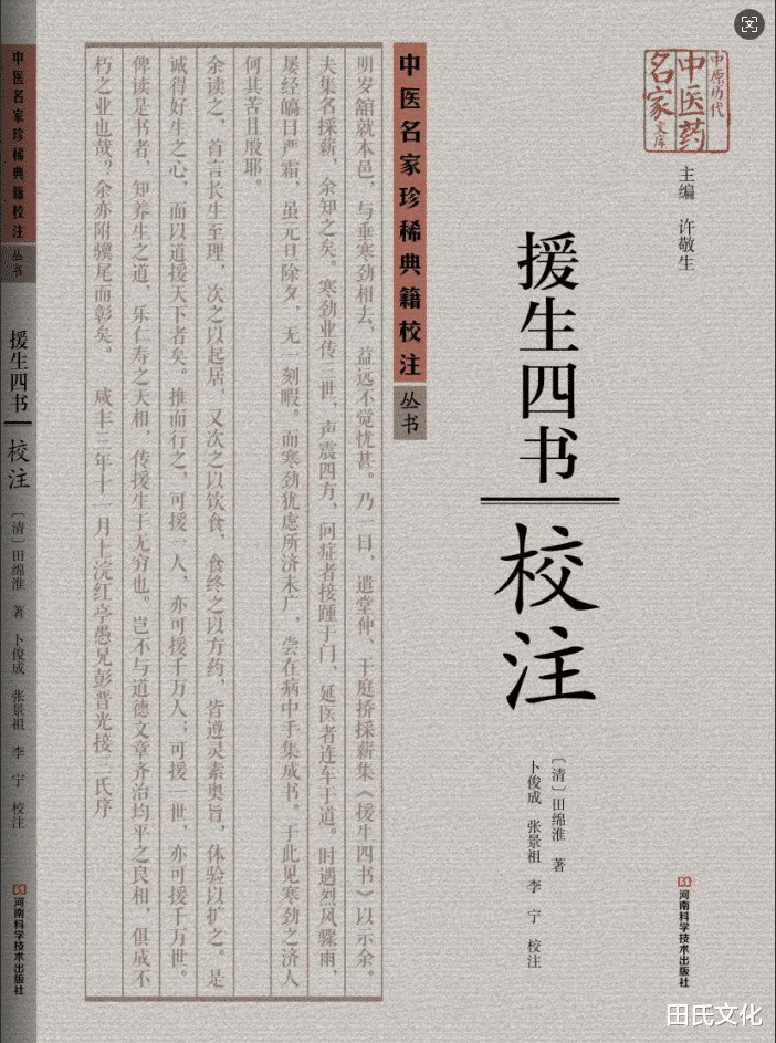 《援生四书》成书于清咸丰三年(1853年),由晚清河南商丘医家田绵淮(1810一1878)基于近50年行医经验编撰。全书分《延命金丹》《护身宝镜》《本草省常》《医方拾锦》四卷,系统收录历代养生理论、导引气功、食疗本草及实用方剂,主张"食药同源"与"治未病"理念。