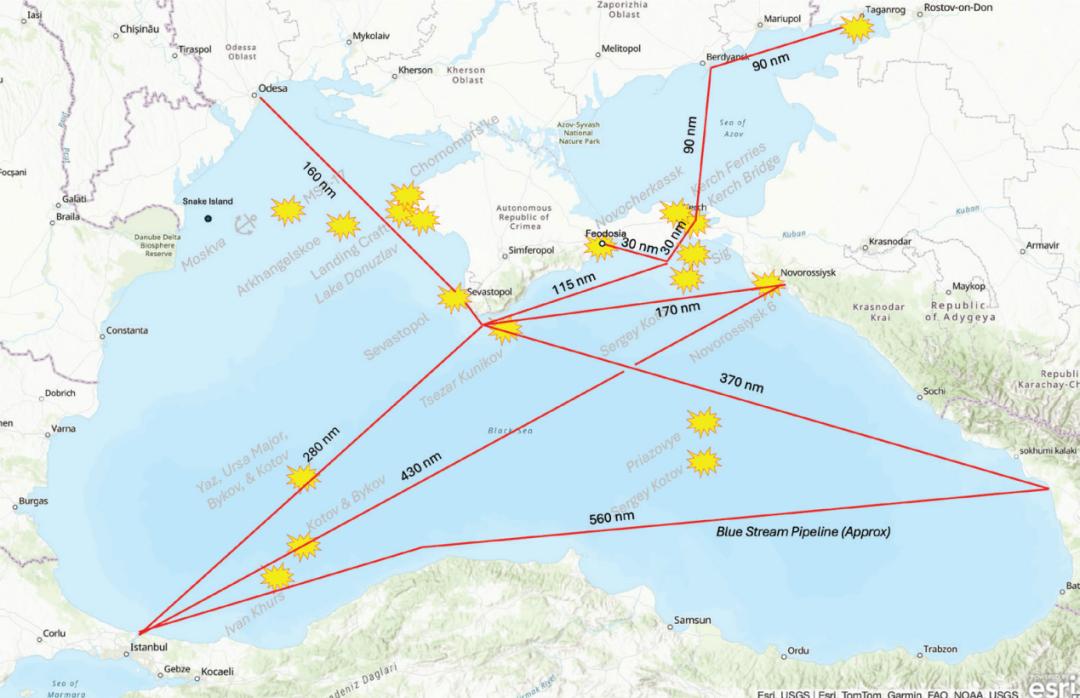 2022年2月24日冲突爆发后不久,俄罗斯军舰封锁了乌克兰港口。出港船只数量从每天超过150艘骤降至几乎为零。2月28日,土耳其关闭了博斯普鲁斯海峡以禁止军舰通行,黑海周边国家(如俄罗斯、乌克兰等)的军事舰艇将无法通过博斯普鲁斯海峡进入地中海,进而影响其在全球海域的行动能力。