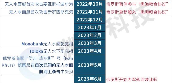 2023年3月22日,乌克兰无人水面艇与遥控无人机协同作战,入侵了塞瓦斯托波尔港。据悉,此次袭击未造成任何损失,但空中和水面无人系统的联合使用较为引人注目。5月24日,乌克兰无人水面艇袭击了俄罗斯“伊万·库尔斯”号侦察船,这是已知首次在海上成功袭击舰船的案例。同一天,俄罗斯方面宣称摧毁了另一艘乌克兰无人水面艇。数周后,俄罗斯开始采用迷彩涂装军舰,这很有可能是为了干扰无人水面艇的光学制导功能。