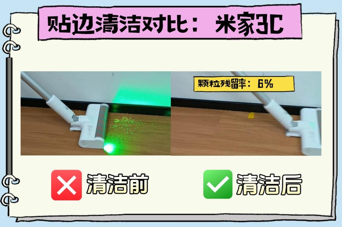 米家3C:米家3C无线吸尘器整体的贴边清洁表现处于中等水平,虽然吸头也能较好地贴合墙边,但在推动过程中,仍有少量碎屑颗粒残留在边角位置,需要二次清理的情况相对CEWEY DS18多一些。