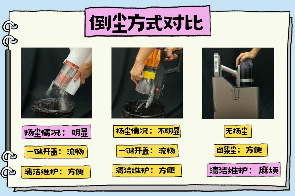 无线吸尘器哪款最好最实用?日常使用无线吸尘器清洁完毕之后,还有一个同样影响用户体验的环节,就是倒灰那个环节,那一刻。有些尘杯设计一开启就扬尘,细微的粉末立即飞得到处都是,不停地打喷嚏就算了,满手都是尘,感受很糟糕,还容易引起二次污染。因此在这项评测里,我特意将尘杯倾倒方式单独拿出来测试。