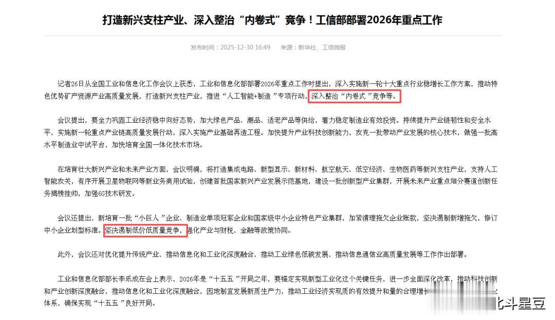 叫停内卷 转向新赛道其实,在这场“政绩观学习教育”之前。去年年底,工信部召开的全国工业和信息化工作会议上,就已经释放了明确信号:“深入整治‘内卷式’竞争”“坚决遏制低价低质量竞争”;