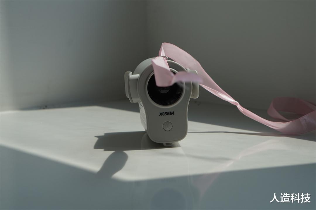 风扇上、下两端各设置了一个挂绳孔,配合厂家送的挂绳,又解锁了一种使用方式——挂脖。这款风扇机身仅有一个按键,这个按键不仅可以开、关机还能调节风速,操作非常方便。