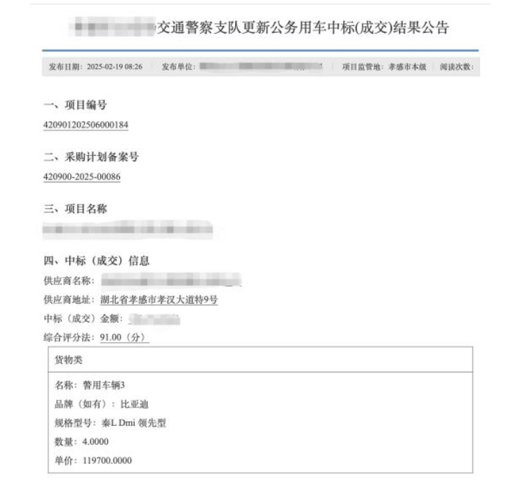 在全国多地政府的实际采购中,比亚迪已成为警车队伍中的“高频面孔”。公开的政府采购公告显示,安徽合肥、辽宁锦州、陕西西安、湖北孝感,再到贵州黔南,多地公安系统的警车采购项目中都出现了比亚迪旗下车型的身影。这些车型覆盖了秦PLUS、宋Pro、宋PLUS等多款主力产品,应用于日常巡逻、刑事侦查等多种执法执勤场景。