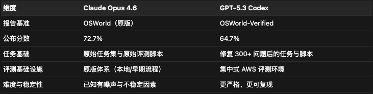 关键区别在于,Claude Opus 4.6报告的是原版OSWorld(72.7%),而 GPT-5.3 Codex报告的是OSWorld-Verified(64.7%)。