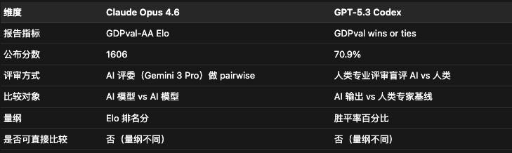GPT-5.3 Codex的“GDPval wins or ties: 70.9%”,使用的是 OpenAI 自己的方法,由职业人类评审盲评 AI 产出与人类专家产出,判断 AI 版本是否“与人类一样好或更好”,分母是固定的人类标准。