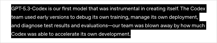 "GPT-5.3 Codex是我们第一个在创造自己的过程中发挥重要作用的模型。"