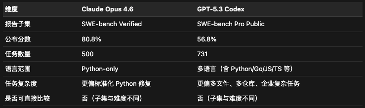 所以说,Claude Opus 4.6在Verified的80.8%与GPT-5.3 codex在Pro Public的56.8%不能直接比较。