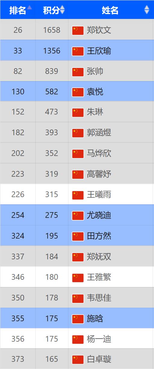 从资格赛打起,最终打进女单第二轮的白卓璇排名大涨329名,来到373位。保持住这份积极的冲劲,重返百大不是梦。