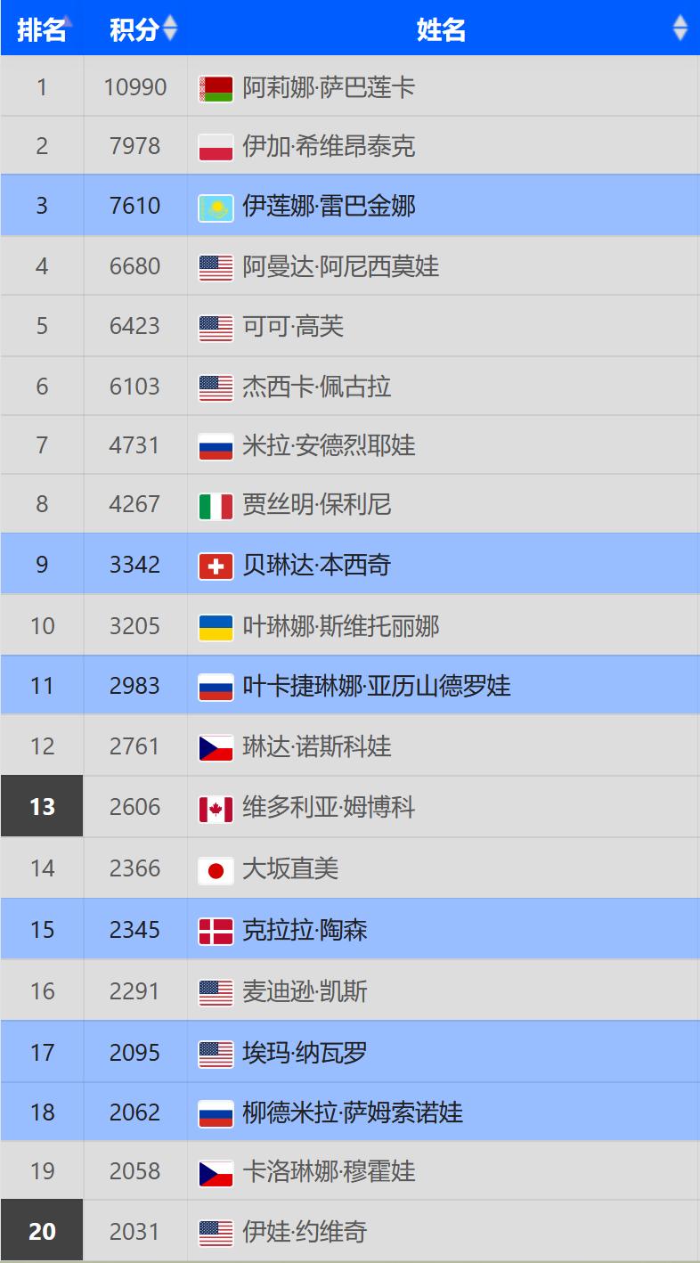 萨巴伦卡虽然连续两年遗憾夺亚,但有斯维泰克的成绩相较于去年是退步的,因此世界第一的积分优势依然在3000分。