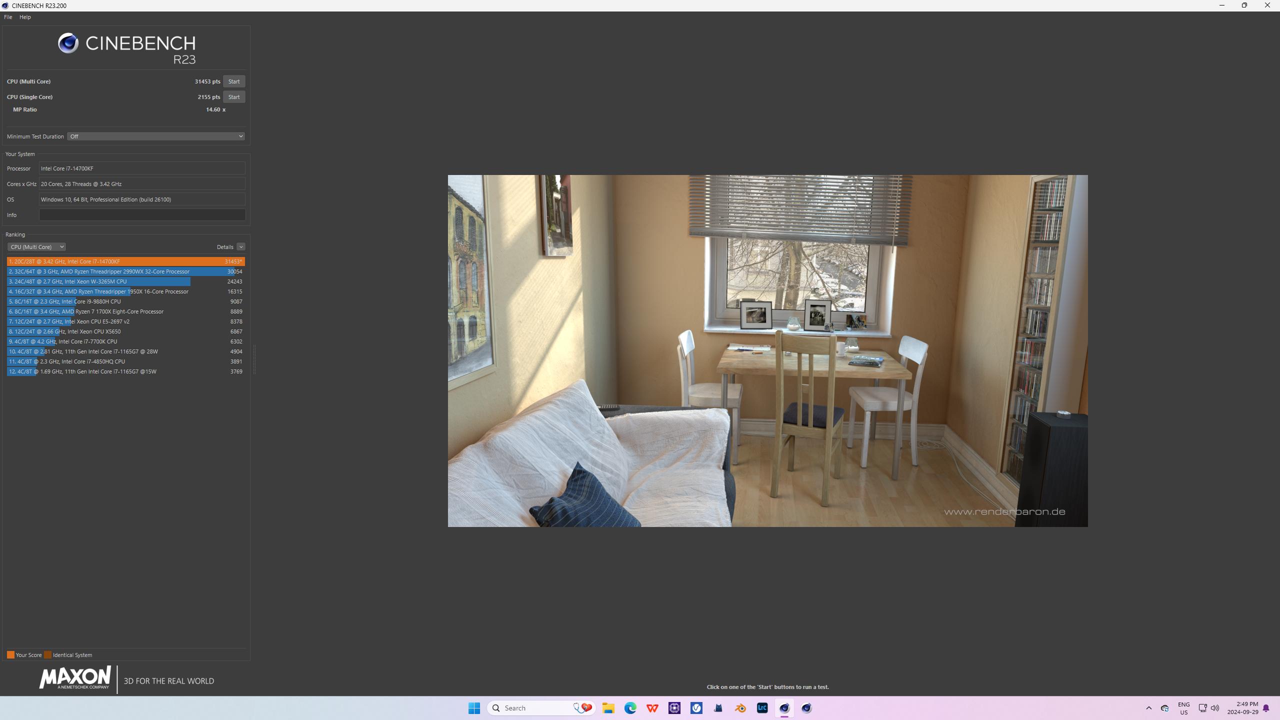 Intel酷睿i7-14700KF采用8性能核+12能效核的混合架构,共20核28线程,基础功耗125W,最大睿频可达5.6GHz,无论是视频剪辑、3D渲染、代码编译,还是平面设计、图片堆栈等操作,都能轻松应对。实测数据显示,在Cinebench R23测试中,14700KF的多核成绩达到31453分,比7800X3D的分数多出1万多分,在Blender渲染、PCMark10生产力测试中,14700KF也展现出碾压性优势。