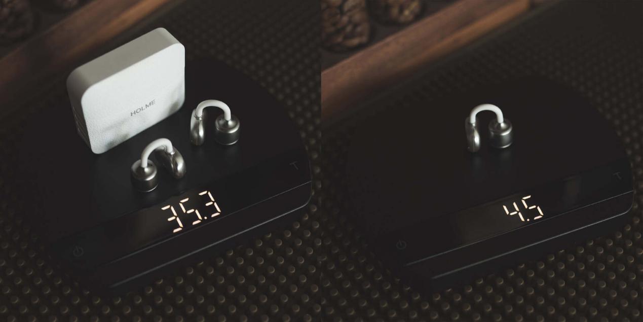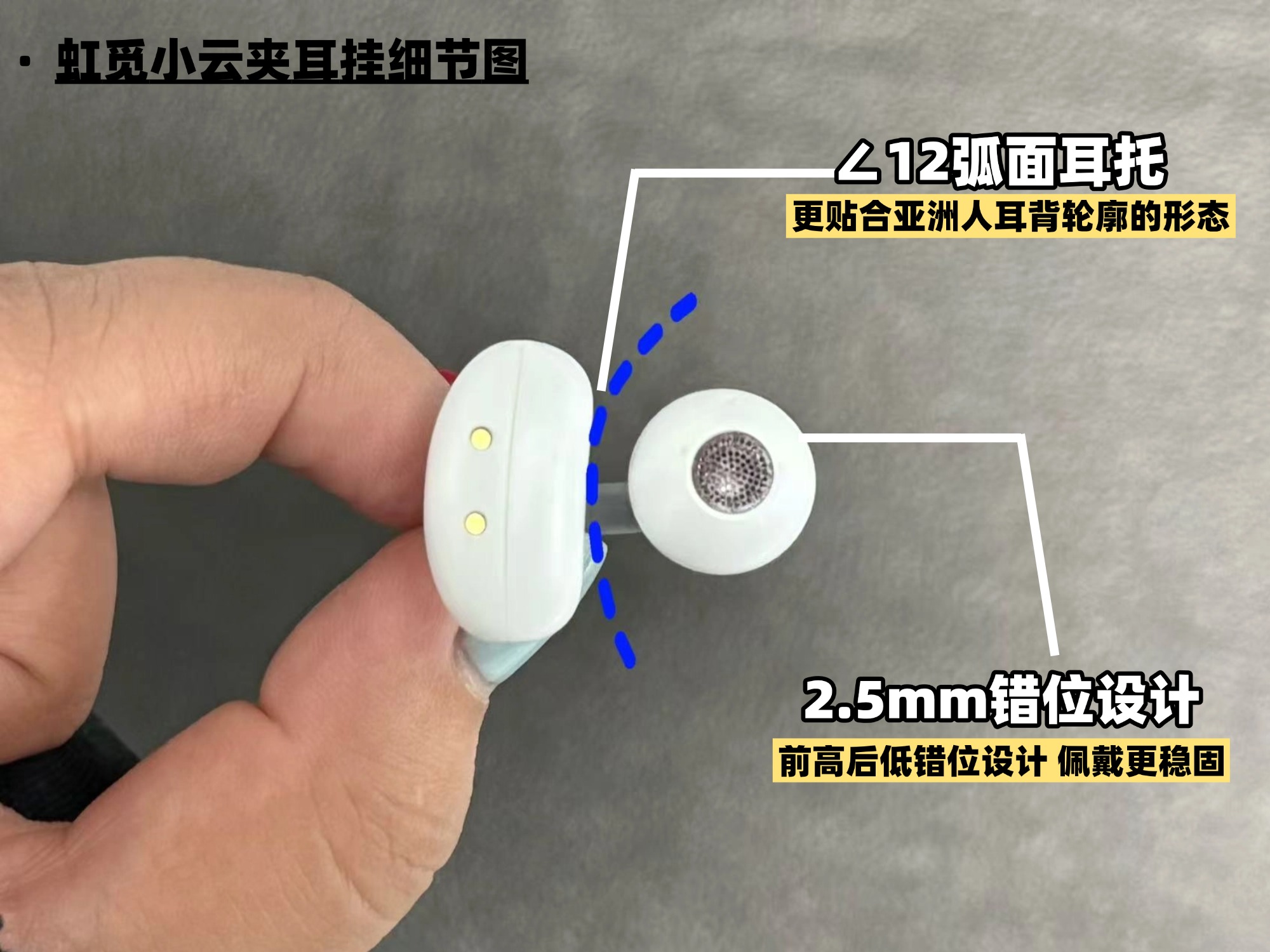 虹觅小云夹耳机的佩戴舒适度设计是非常到位的。耳机采用了前高后低的2.5mm错位设计,上耳可以完美贴合人体的耳部曲线,大大的提高了耳夹的稳定性。同时耳机的电池位设计成了∠12弧面耳托,这个弧度可以更丝滑顺畅的贴合人体耳背,提供更加科学稳定的支撑角度,使得佩戴更加的舒适!单耳的重量仅有4.5克,非常轻巧,长时间佩戴也没有压力!