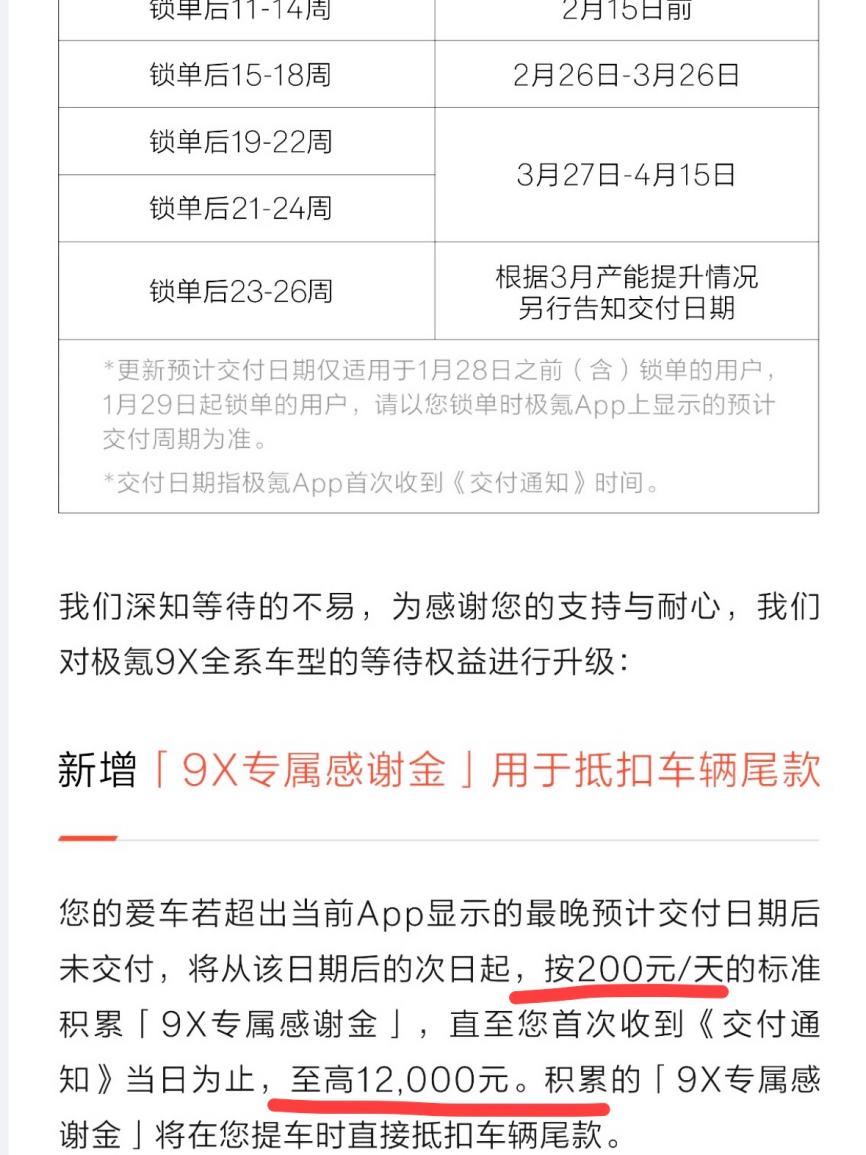 突然刷到极氪官方的通知,说是9X Hyper版订单爆了,导致部分订单可能会延期交付。本来以为又要无限期等……结果往下一看,延期一天补200,最多补到12000!