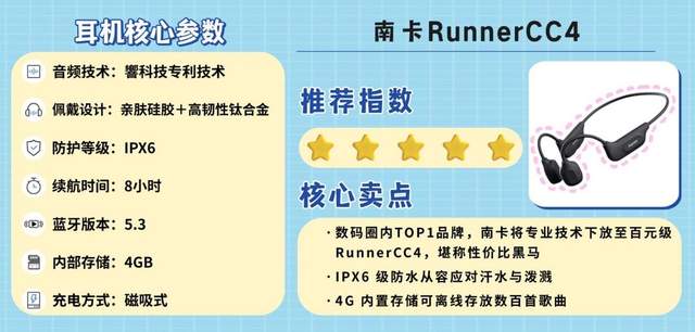 南卡深耕骨传导十余年,将专业技术下放至百元级RunnerCC4,让预算有限的用户也能畅享高品质骨传导体验,堪称性价比黑马。