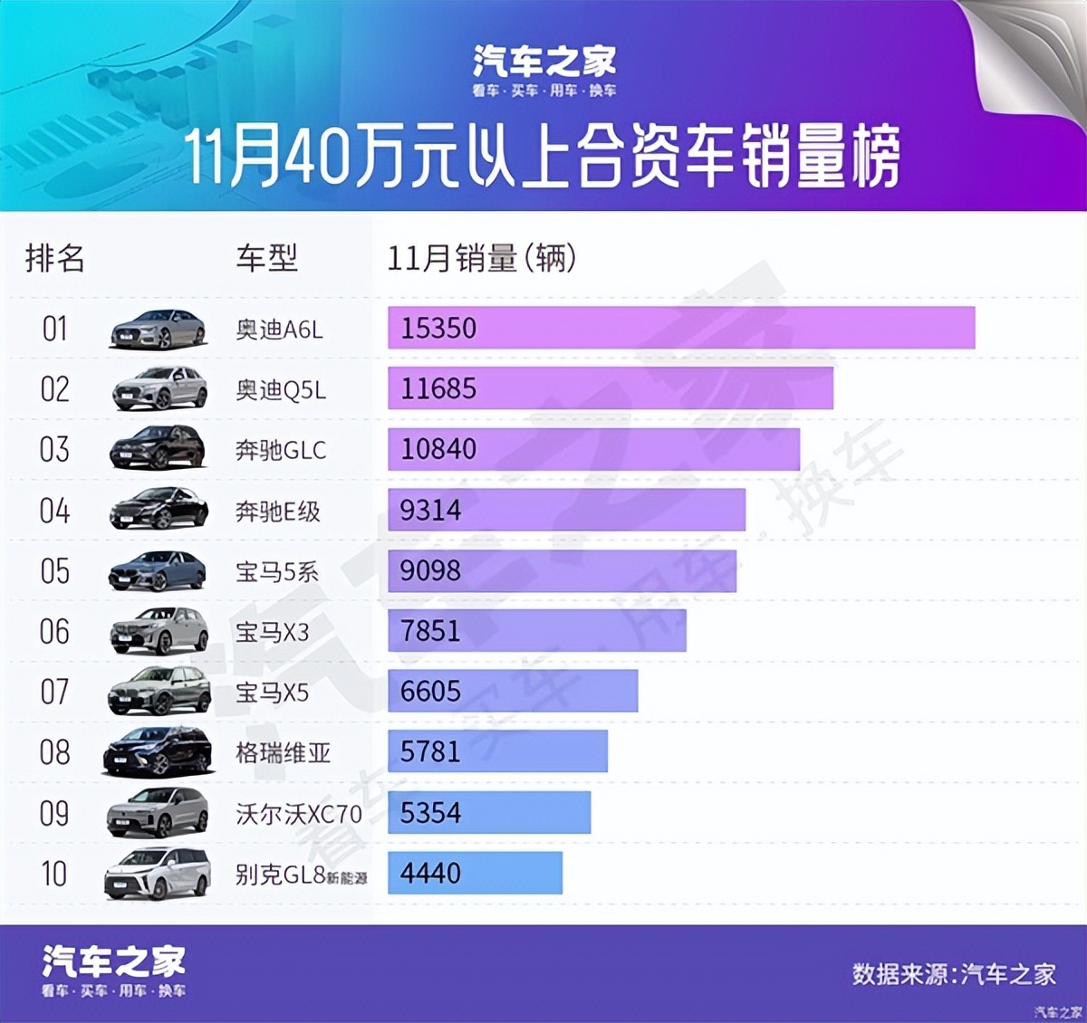 聚焦40万元以上合资车榜单,德系豪华品牌BBA包揽前五名:奥迪A6L以15350辆领跑,奥迪Q5L、奔驰GLC分别以11685辆、10840辆位列第二、第三。