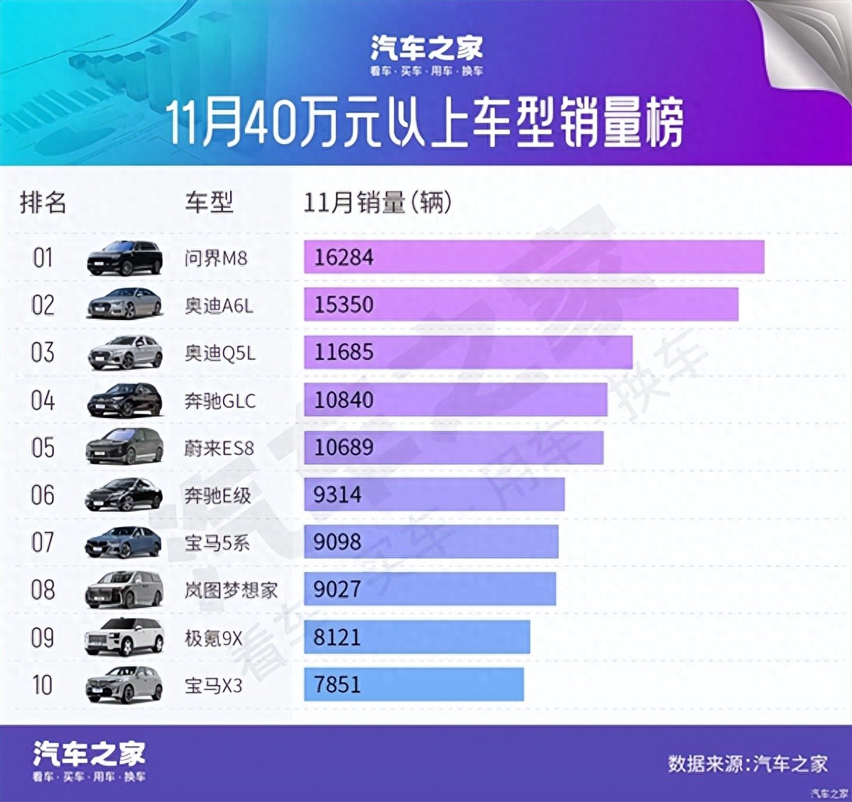 奔驰E级、宝马5系、岚图梦想家、极氪9X、宝马X3依次以9314辆、9098辆、9027辆、8121辆、7851辆进入总榜前十。