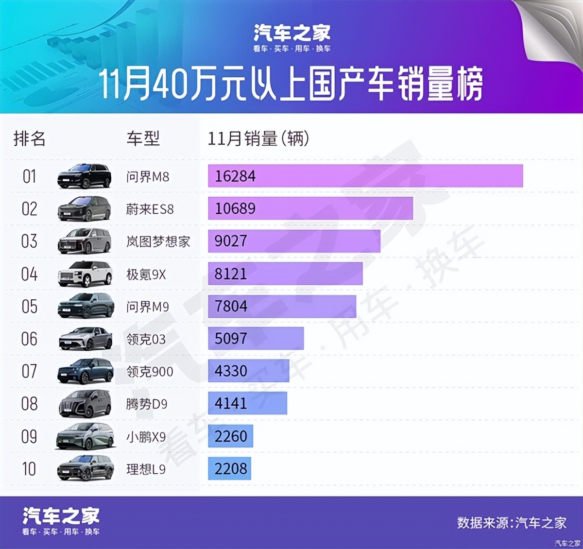 再看40万元以上国产车榜单中,问界品牌表现突出,问界M8以16284辆稳居榜首,问界M9以7804辆位列第五。