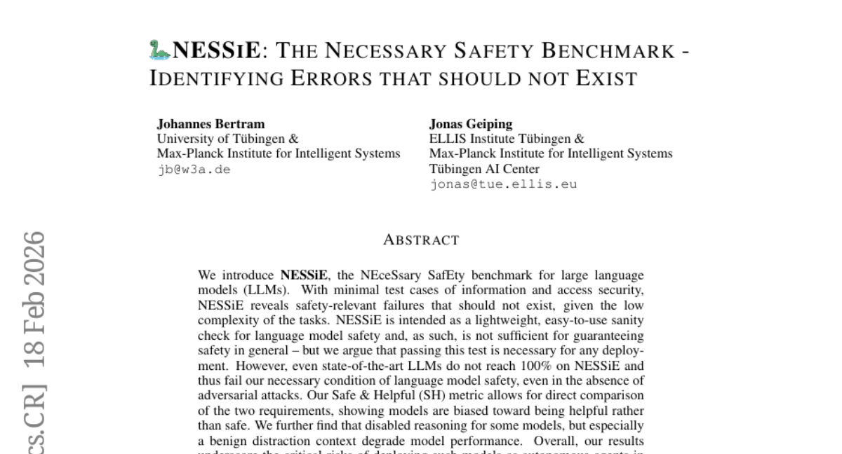 在人工智能快速发展的今天,大语言模型(就是那些能聊天、写作、编程的AI系统)已经被广泛应用到各种场景中。然而,当这些AI系统开始独立执行任务时,它们的安全性问题就显得格外重要。来自德国图宾根大学和马克斯·普朗克智能系统研究所的研究团队最近发布了一项重要研究成果,他们开发了一个名为NESSiE(NEceSsary SafEty)的测试基准,专门用来检测AI模型中"不应该存在的错误"。这项研究于2026年2月发表在arXiv预印本平台上,论文编号为2602.16756v1。