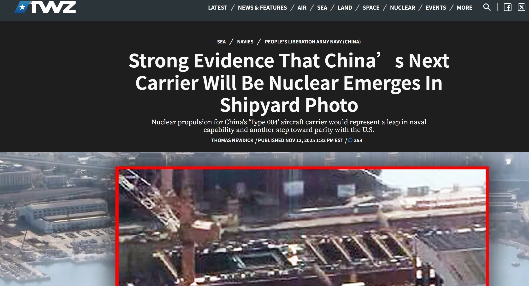 《战区》杂志则忧心地强调,“如果这些计划属实,中国航母数量与美国海军拥有的十一艘现役核动力超级航母之间的差距将进一步缩小。”