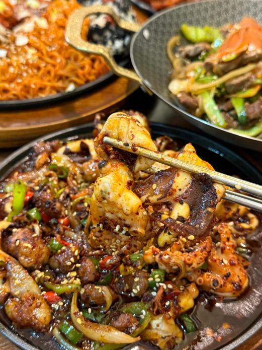 烤五花肉肥瘦适中,配生菜不腻,部队火锅料挺足,就是味道偏咸一点。小菜可以免费续 泡菜爽口。