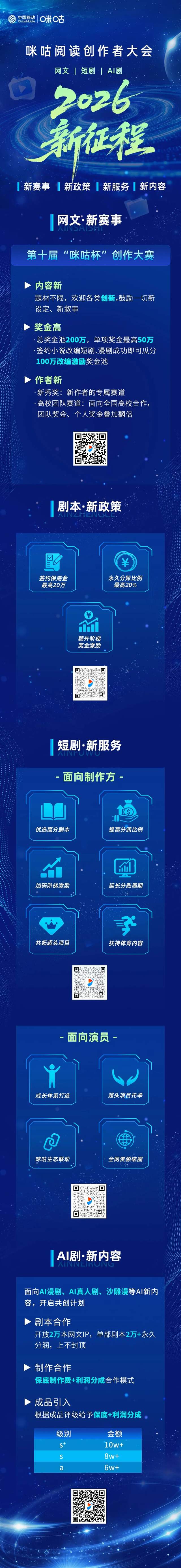 在这些成绩的基础上,咪咕又将开启新的征程。在大会第三篇章的“繁星沐光”环节,中国移动咪咕数媒党委副书记、总经理马李永正式发布2026年咪咕阅读“新赛事、新政策、新服务、新内容、新运营”五新征程创作者合作政策,全面升级对网文、短剧、AI剧创作者的扶持体系,实现从内容创作到IP变现的全链路赋能升级,真正践行“好故事+好制作+长期主义=打造好IP”的逻辑。