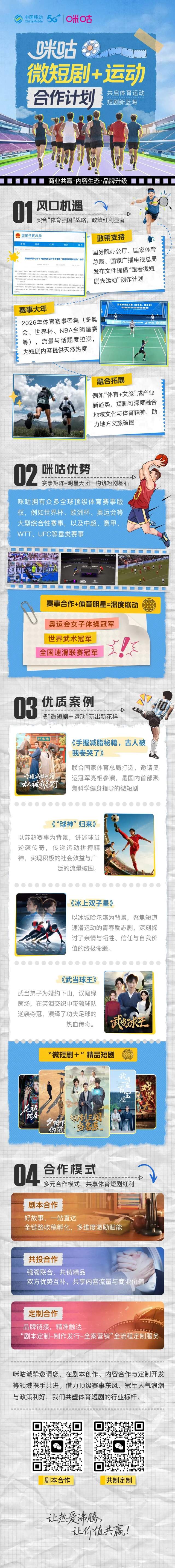 咪咕还结合自身优势,积极响应国家体育总局和国家广电总局“跟着微短剧去运动”创作计划,推出了剧本合作、共投合作、定制合作三大合作计划,在“微短剧+运动”领域全力打造精品微短剧。