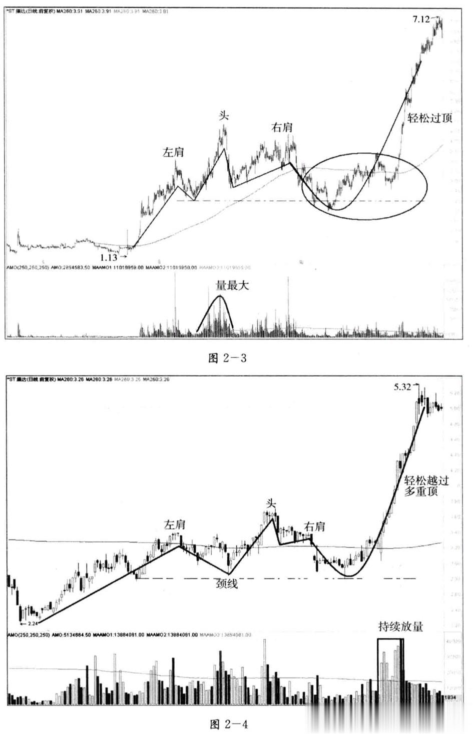 图2-3是ST康达(000048)在1996~1998长达两年间的吸筹K线图,这个案例虽然“古老”但却十分经典。股价放量拉升形成左肩,之后持续放量造头,从整体来看,头部的量最大。在整个头肩顶完成之后,股价回落,但在绝大多数情况下,是在左肩最低点企稳重新回升,这是假头肩顶的最大特点。