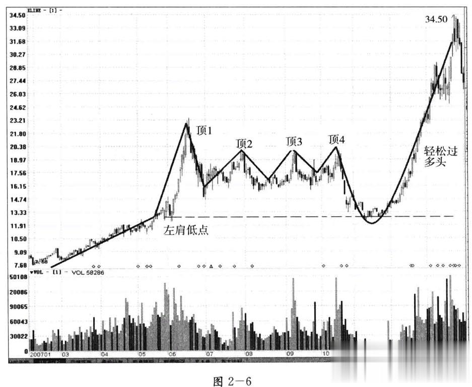图2-6是2007年飙升的牛股兴发集团(600141)的K线图。股价在最左面有过放量持续拉升,形成顶部1,之后不断走出顶2、顶3和顶4,每个顶部都急剧放量,而且持续的时间较短,这是长庄收集筹码的第一个迹象;股价最终向下突破,刚好回落到左肩低点止跌企稳,这是长庄吸筹的第二个迹象;之后,股价在量能的配合下持续攀升,轻松突破四个顶部,这真是不可思议的事情。