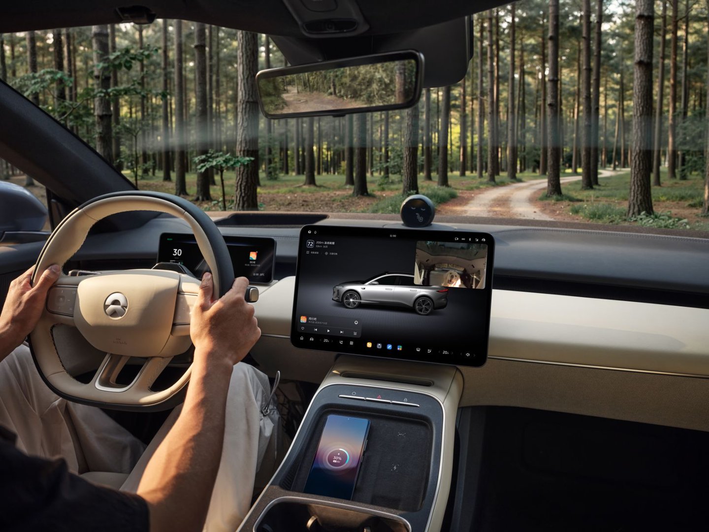 进入车内可以看到,蔚来ET5T和目前市面上大多数电车一样,走的都是极简路线,车内前排配备10.2英寸液晶仪表盘和15.6英寸中控大屏,外加18.8英寸HUD抬头显示,车机内置高通8295P芯片,语音支持四区域唤醒、连续识别以及可见即可说功能,科技感营造得足够到位。