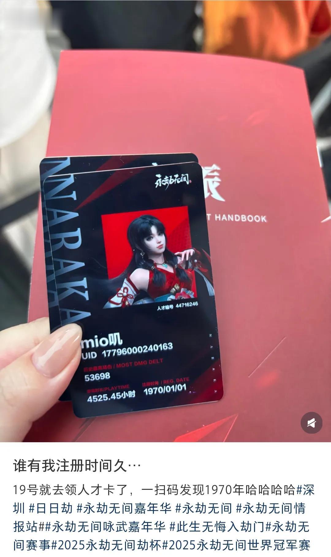 除了之前提到的巨型宁红夜雕塑,《永劫无间》还搞了个“深振人才卡”的neta设定,用带有城市特色的身份认证,构建玩家认同感。而在打印时,有玩家触发了系统bug,注册时间显示成了1970年,帖子发到网上,立马有人在评论区吐槽:“聚窟洲来了个元谋人。”
